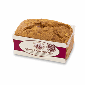 Wheat flour, sugar, glace cherries (19%) (cherries, glucose-fructose syrup, preservative (sorbic acid), colour (E127), citric acid), flaked almonds (1%), vegetable margarine (palm oil, rapeseed oil, salt, water), vegetable glycerin, apple juice from concentrate, raising agents (diphosphates, sodium bicarbonate), rapeseed oil, preservative (potassium sorbate), natural bitter almond flavour, glaze (sugar, water, glucose syrup, gelling agent (pectin), citric acid, acidity regulator (sodium citrates))