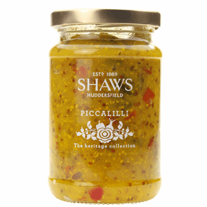 Cauliflower (23%)(SULPHITES), sugar, distilled malt vinegar (from BARLEY), water, silverskin onions (11%)(SULPHITES), gherkins (10%)(Gherkins, spirit vinegar,sugar, salt), red pepper, wholegrain MUSTARD(4%) (water, MUSTARD seeds, alcohol vinegar, salt), cornflour, MUSTARD powder, ginger puree, turmeric.