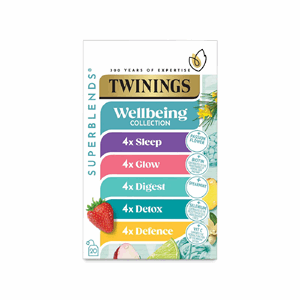 Superblends Defence: Citrus & Ginger Flavoured Herbal Infusion with Green Tea, Echinacea Root and added Vitamin C., Ingredients: Green Tea (26%), Ginger Root (15%), White Hibiscus, Cinnamon Bark, Natural Lemon Flavouring with Other Natural Flavourings (10%), Echinacea Root (9%), Lemon Peel (5%), Natural Flavouring, Natural Lime Flavouring (4%), Vitamin C (2%)., Superblends Glow: Strawberry and Cucumber Flavoured Herbal Infusion with Green Tea, Aloe Vera and added Biotin., Ingredients: Green Tea (39%), Apple Pieces, Nettle, Natural Strawberry Flavouring with Other Natural Flavourings (8%), Peppermint, Natural Cucumber Flavouring (5%), Natural Flavouring, Aloe Vera Juice Granules (1%), Biotin (1%)., Superblends Digest: Apple Flavoured Herbal Infusion with Spearmint, Rooibos and Baobab., Ingredients: Spearmint (34%), Rooibos Leaves (18%), Natural Apple Flavouring with Other Natural Flavourings (15%), Ginger, Peppermint, Apple Pieces (7%), Baobab Fruit Pulp Granules (5%). , Superblends Detox:, Lemon Flavoured Infusion with Burdock Root, Fennel, Ginger and added Selenium., Ingredients: Fennel (20%), Lemon Peel (16%), Lemongrass, Burdock Root (10%), Ginger (10%), Spearmint, Natural Lemon Flavouring with Other Natural Flavourings (7%), Rooibos, Natural Lemongrass Flavouring, Verbena, Selenium (1%), Natural Basil Flavouring with Other Natural Flavourings., Superblends Sleep: Spiced Apple and Vanilla Flavoured Herbal Infusion with Camomile and Passionflower., Ingredients: Passionflower (35%), Apple Pieces (15%), Camomile (14%), Cinnamon Bark (10%), Natural Apple Flavouring with Other Natural Flavourings (10%), Cardamom (6%), Cloves (6%), Natural Vanilla Flavouring with Other Natural Flavourings (4%). , ,